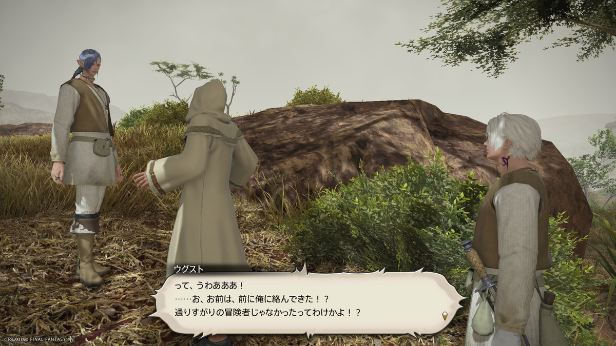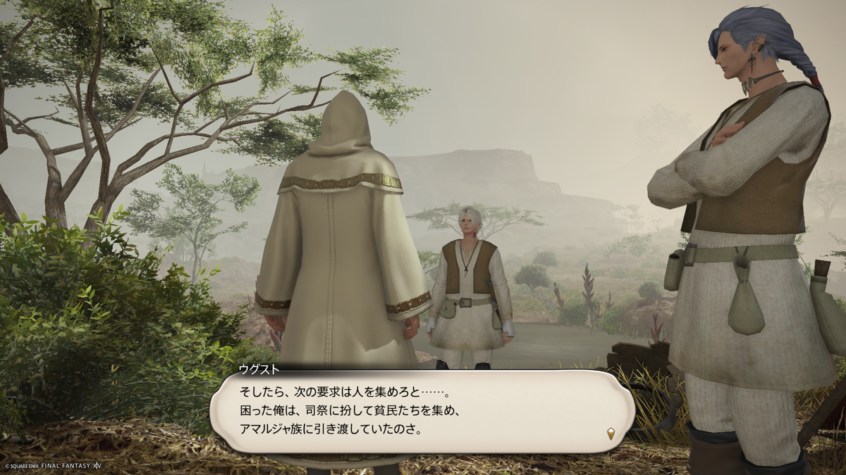 キャンプ・ドライボーン近郊にて、司祭になりすまして貧民を騙していた商人ウグストの正体を暴き、サンクレッドが彼を問い詰め、主人公はそれを斜め後方に立って見ている場面です。