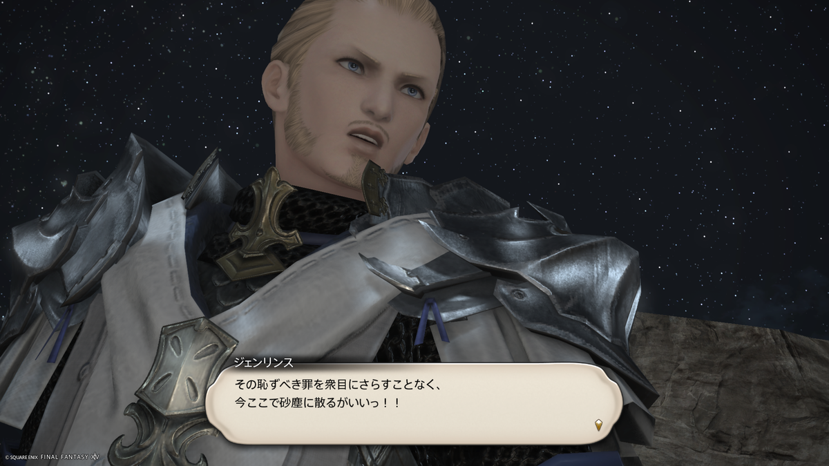 ナイトのジョブクエストに登場するウルダハ銀冑団総長のジェンリンスは、主人公をウルダハ王家に対する逆賊と信じ込んで僻地へおびき出し、「銀冑団の同志」総出で戦いを挑んできます。