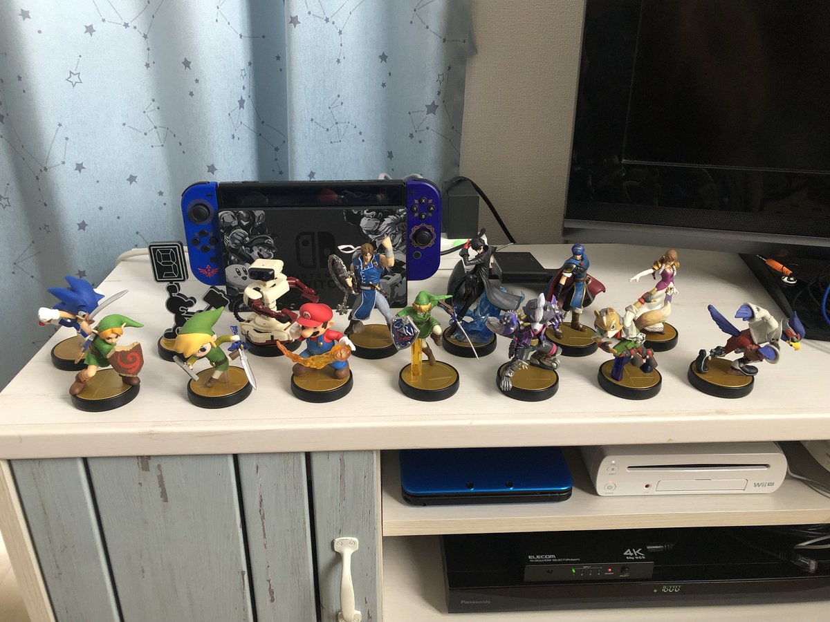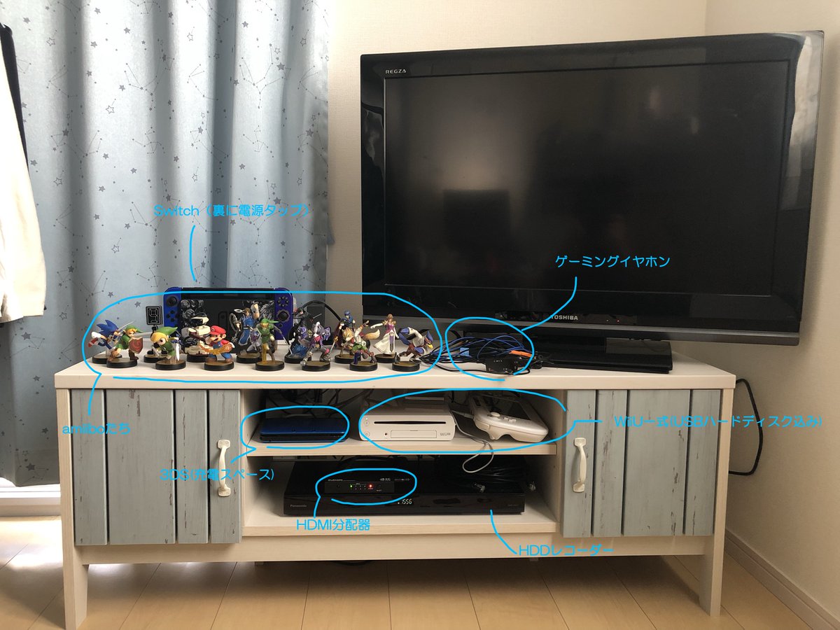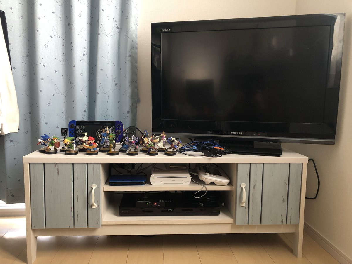 テレビ周辺の大整理がとりあえず終わりました。テレビ台もカラーボックス横置きからちゃんとしたローボードに変えたのですが、収納扉の色がカーテンの色味と似ていて統一感もあり好ましいです。まとまったスペースが確保できたので、仕舞い込んでいたamiiboも改めて飾りました。