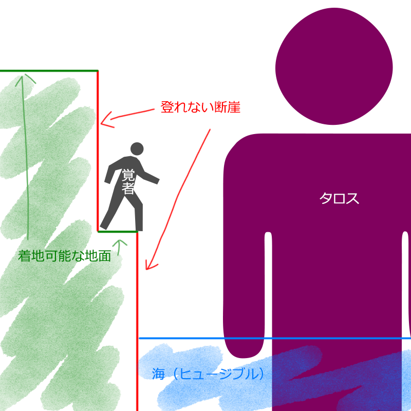 そのタロス戦で1回詰みました。状況は図のとおり別にここ以外でも発生しうるものでした。こうなったらもう上にも下にも行けないじゃん……とセーブせずタイトルに戻ったのですが、そういえばこの時点でリディルを持っていたのだから使えばよかった……?