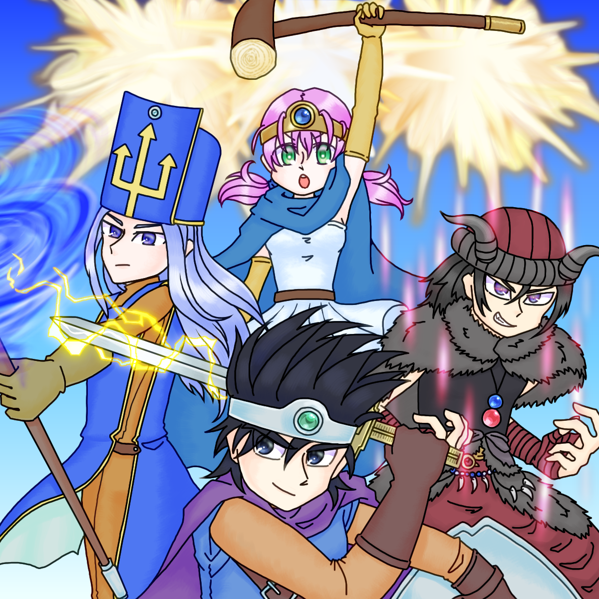 クリア記念とイラストソフトを変えたので扱いの練習とで、クリア時の勇者一行を。勇者以外の顔立ちや眼の色が公式イラストとまるで違う(まもの使いなんか体格からして全然違う)のは、俺解釈ということで大目に見てください。