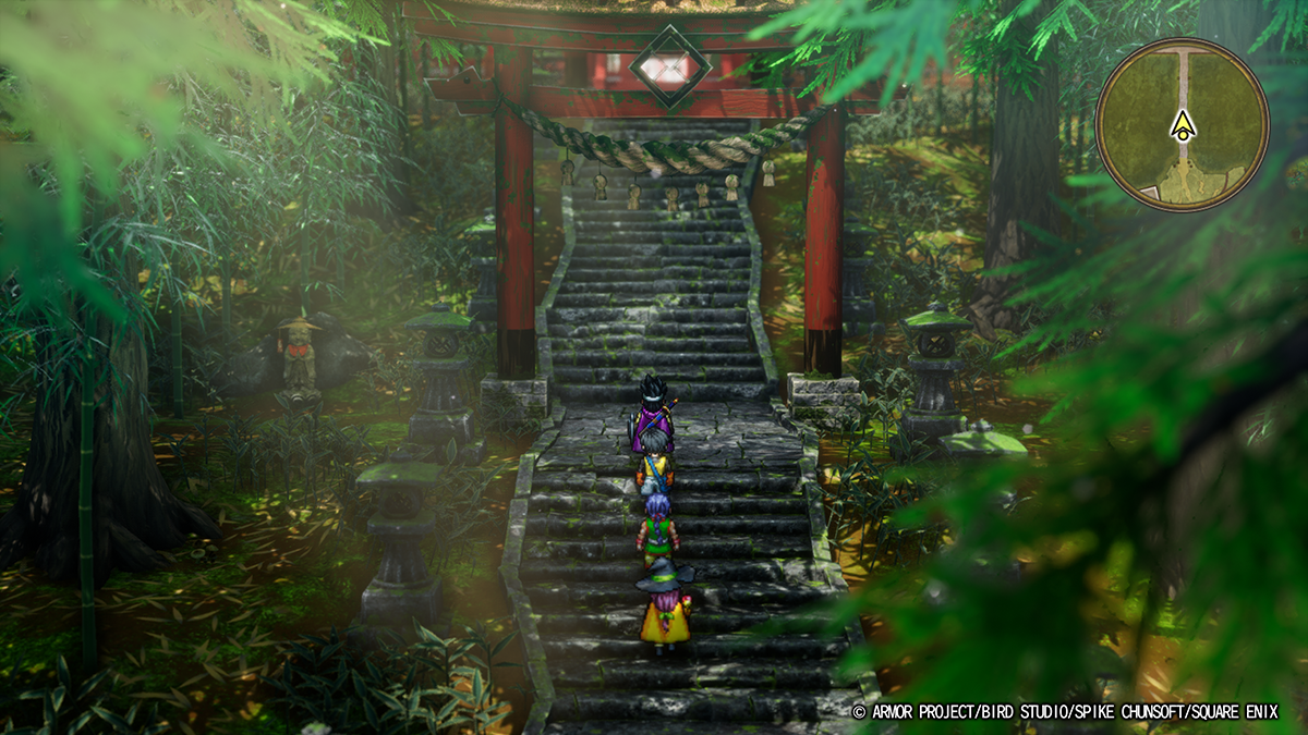 バハラタの人さらいはまぁ前述のとおり何とかならないかなと思いつつ、レベル不足だったのか勝利後にごりごりレベルアップして全回復したので、報告に戻る前にちょっと散策しようと思ったらダーマ神殿に着いたのですが、今作のダーマはオリエンタル、というか、思いっきり仏教? いえ、そう大層な学があるワケではなく、ビシュテンゴ武器が仏教関連の道具モチーフだったなというので覚えていただけなのですが(特にハンマーの五鈷杵)。