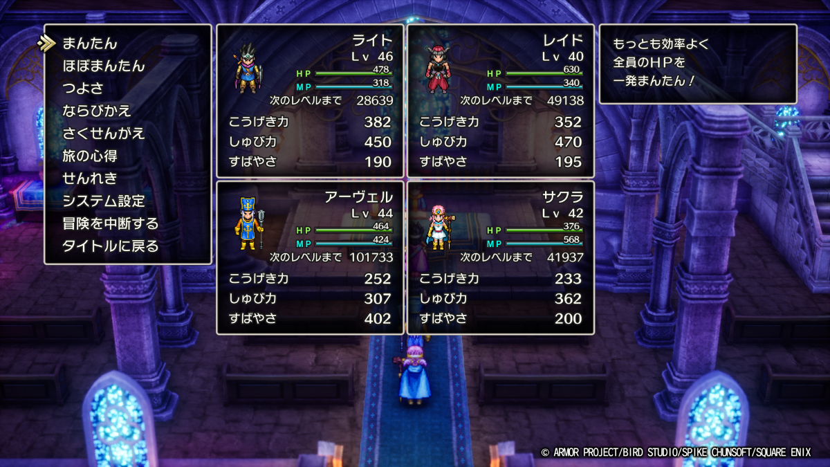 総括すると、「いい意味で『普通のRPG』」でした。プレイ時間40時間弱というのも一般的なRPGのそれとおおむね近いです。原作や過去のリメイクをプレイしている人には「次の目的を何もかも説明されるだとか、全体的に親切設計がすぎる」という意見もあるようですが、私は本リメイクが初プレイなので、ジパングやランシールにどうもめちゃくちゃな航路で向かったらしかったり商人の町でちょっと詰まったりしていたので、これくらいのガイドならあるほうがありがたかったです。