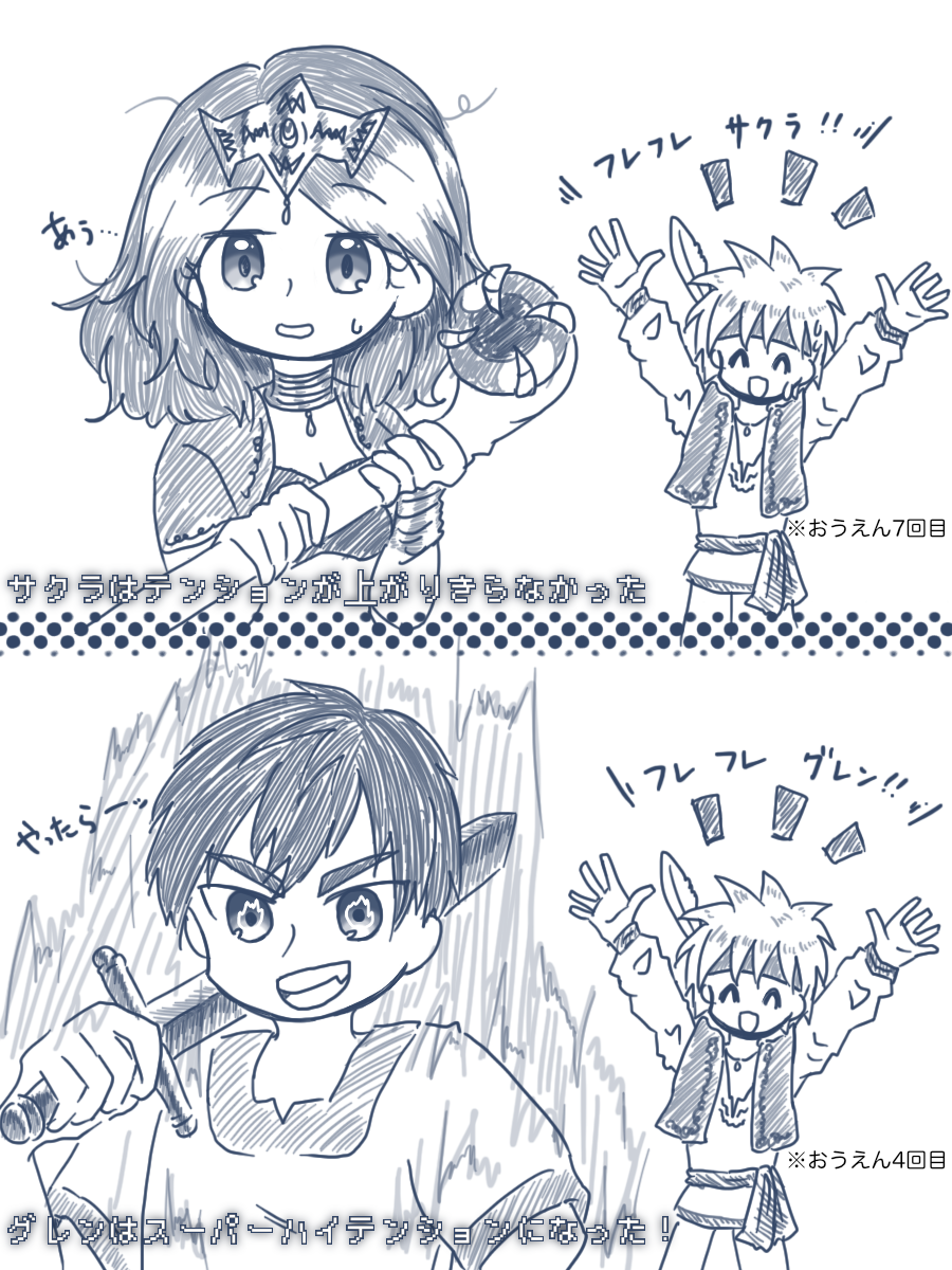 で、主人公を旅芸人のまま放っておくと終盤頃には「足を引っ張ることはないが特別貢献もしない」になっていくと知っていたので、「早めに転職しておくか……?」ととりあえずバトマスを候補にして転職クエをやってみて、そのために酒場から引っ張り出してきた戦士グレン(同じく創作長編のパーティメンバー。イラストログ①に何枚か絵のある赤髪眼鏡)をLv5まで上げてドラゴン斬り役を任せたのですが、この人妙にテンションが上がりやすいんですよね……。旅芸人の職クエで適当におうえんしたサクラは4回目でSHTなんて絶対ならなかったのに、グレンは早いと4回目、遅くとも5回目には上がりました。なんというか、期待を裏切らん人です。