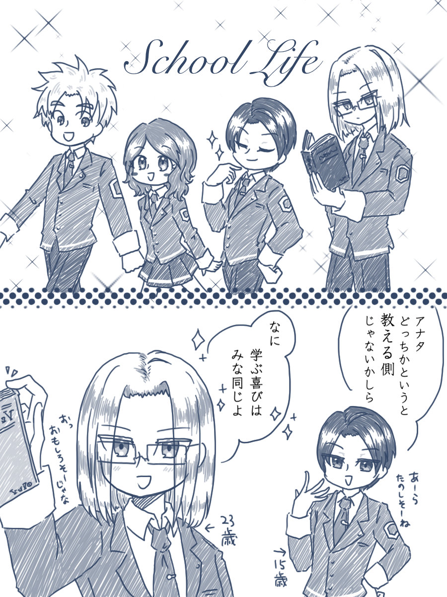 初プレイ当時はパーティメンバー全員に制服上下を着せて進めたのに、今や支給されたブレザーだけ主人公に着せておしまいなのは、おとなってつまんないの! ということで、せめてもで描きました。キャラ引用元の創作長編だと、ライト&レイド15歳、サクラ11歳、アーヴェル23歳なので、私には面白くて仕方がありません、という絵。