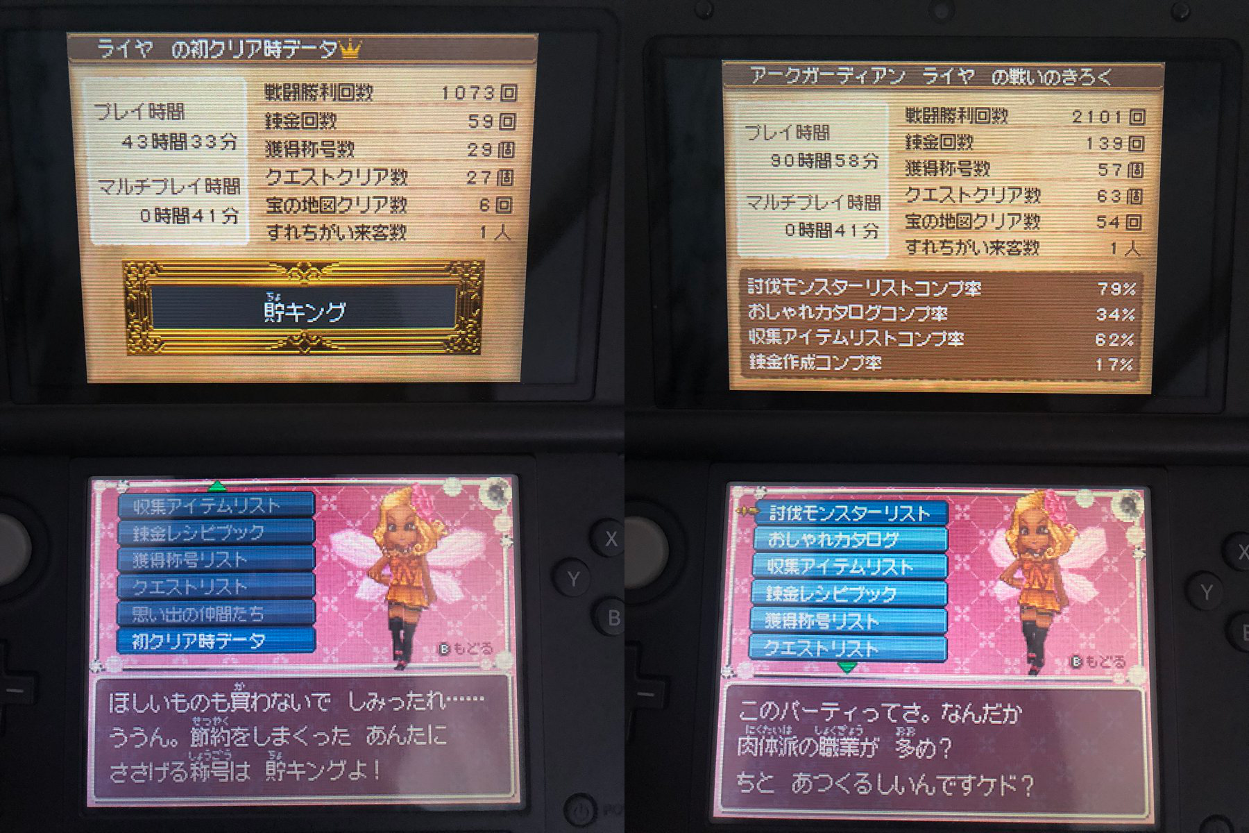 絶対に3DS本体に刺激を加えないように保持し続けてエンディングを見ていったら、「天の箱舟が飛び去る(最初にソフトが落ちた時点)→飛び去った箱舟を見上げる主人公に突風が吹き付ける→どこからか降ってきた女神の果実が沖合に落ちていく→to be continued」の直後に「冒険の書に記録しますか?」とシステムメッセージが出て……「初回は本当にあと1分保っていれば“クリア”できたじゃないか……」が四半分、「プライドは捨てたけど今度こそ“クリア”したからもういい……」が四半分、あとの半分は達成感と満足感、という感じです……。