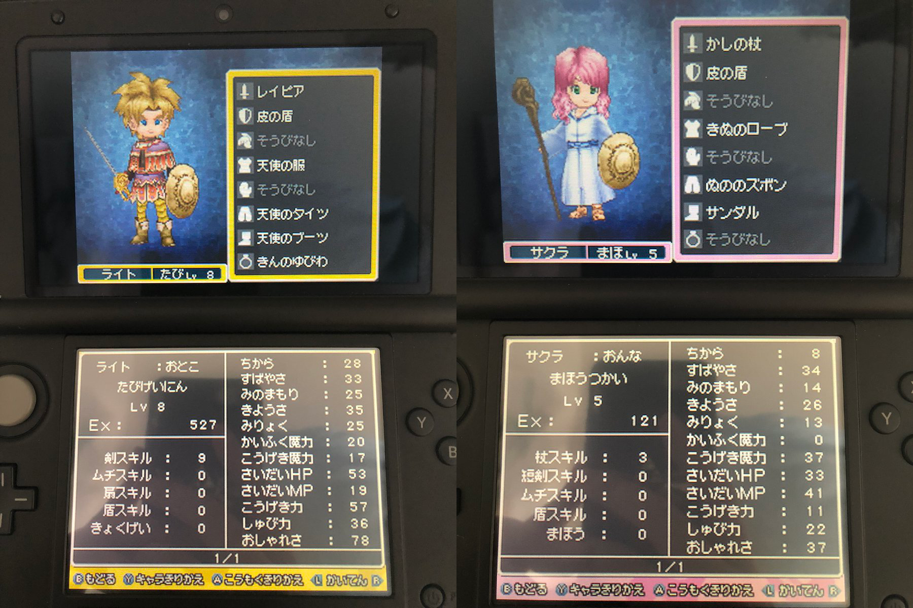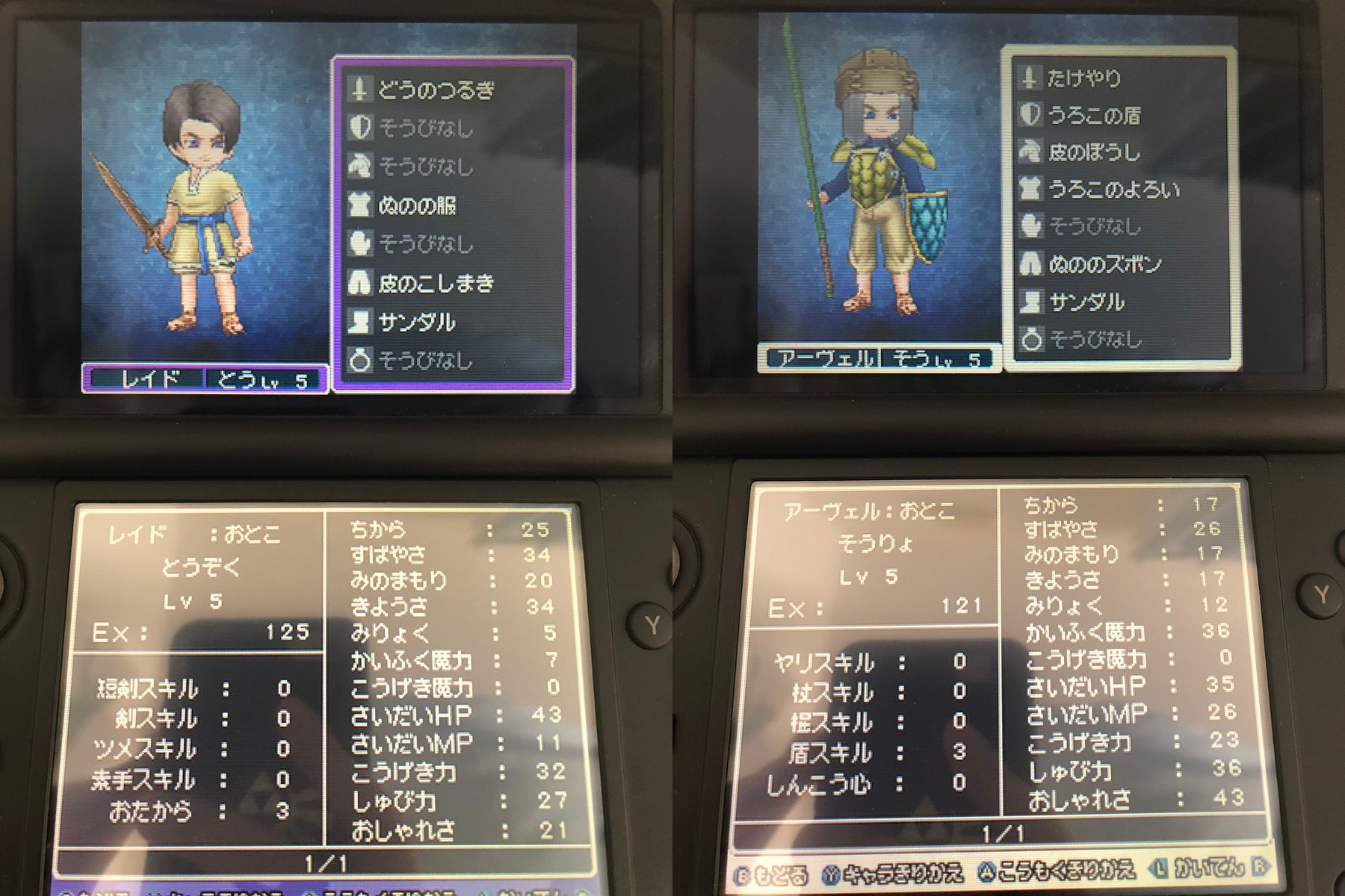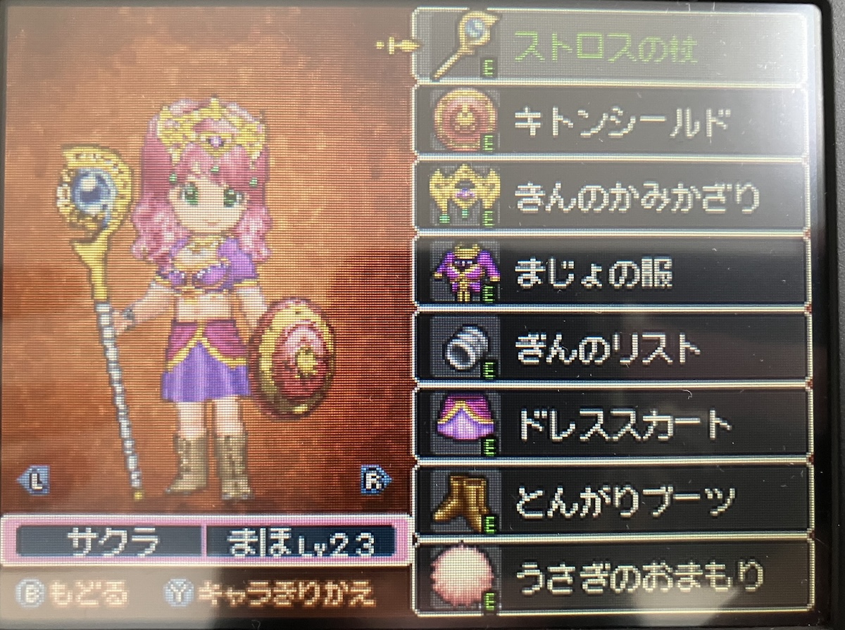 復活したのは翌日です。魔法使いサクラと僧侶アーヴェルはちょっとでも削れているとマダンテに耐えられないなと思い、攻略情報を漁ってイチバン手っ取り早いHPパッシブを探した結果バトルマスターに行き着き、闘魂32ptまでは取得して、アーヴェルはHP200超とサクラもどうにか199、ついでにゴールドも稼いでサクラにはカラコタ橋の妖しいお店でジャガードレスを、アーヴェルにはドミールでやみのころもを買い、攻撃&回復魔力はちょっと犠牲になるけど守備力とちょっとだけ見た目重視にからだ下も整えました。あと、レイドはドミールで買ったビッグボウガンを売り払って妖しいお店でケイロンの弓に変えました。ベホマラー並みは期待しないまでも、道中の消耗回復くらいの最低限の足しにならないかな、と。