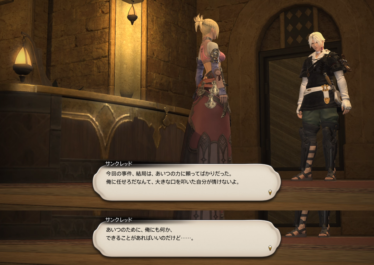 ここは人の出入りが激しいが、動きがあるとサンクレッドを優先して探すようになったので僕はもう駄目だ。あの人がいないと落ち着かない。お兄ちゃん属性大好き人間、無事「同胞と先輩の中間的ポジション」に懐く。