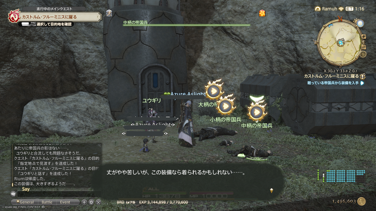 続いてメッフリッドの任務……なんだけど、「まさかここで再会するとは思わなかったぞ」と言われて全然ピンとこなかったので、「……ごめん」を選んだら、そうかクォーリーミルのアラミゴ難民の部隊長か……!