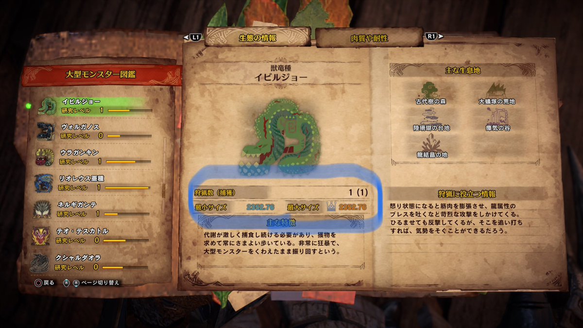 プレイ開始はおとといなのですが、まぁ本当に万物の情報量が多くて、今は何を進めていて、数値化した進行度=HRはいくつなのかさえ、まだよくわかっていません。とりあえず大蟻塚の荒地で任務クエのジュラトドスは狩りました。