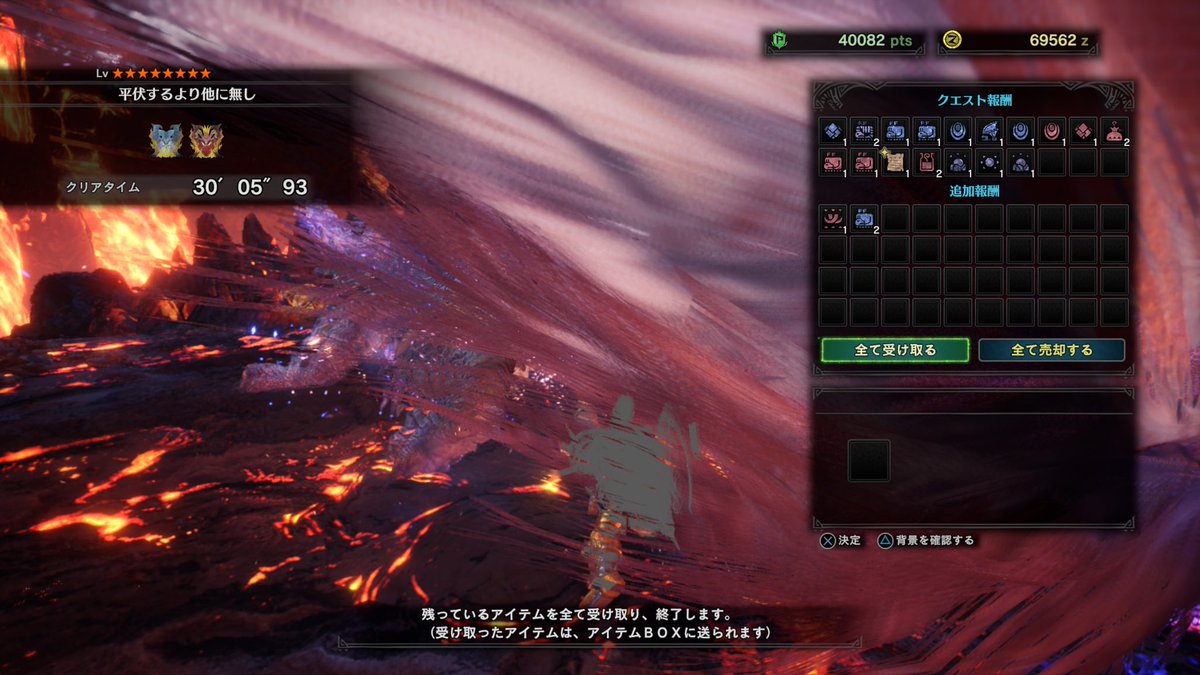 で、テオ単体を討伐できてナナ単体を撃退できたからといって、テオナナ同時討伐ができるかというと、まったく話が違うワケでして、案の定最初から同エリアにいるし火やら爆破やら青い火やらもみくちゃにされ、どちらから倒すべきか悩んだすえ、結局どっちも倒すんだよ!と目についたほうをひたすら攻撃する方針にしたところ、ナナが瀕死になって飛び去った先でテオも休眠していて、2頭に同時に爆風が当たるように睡眠爆破からそれぞれと最後の攻防 で、テオ→ナナの順に討伐成功しました。疲れた……。