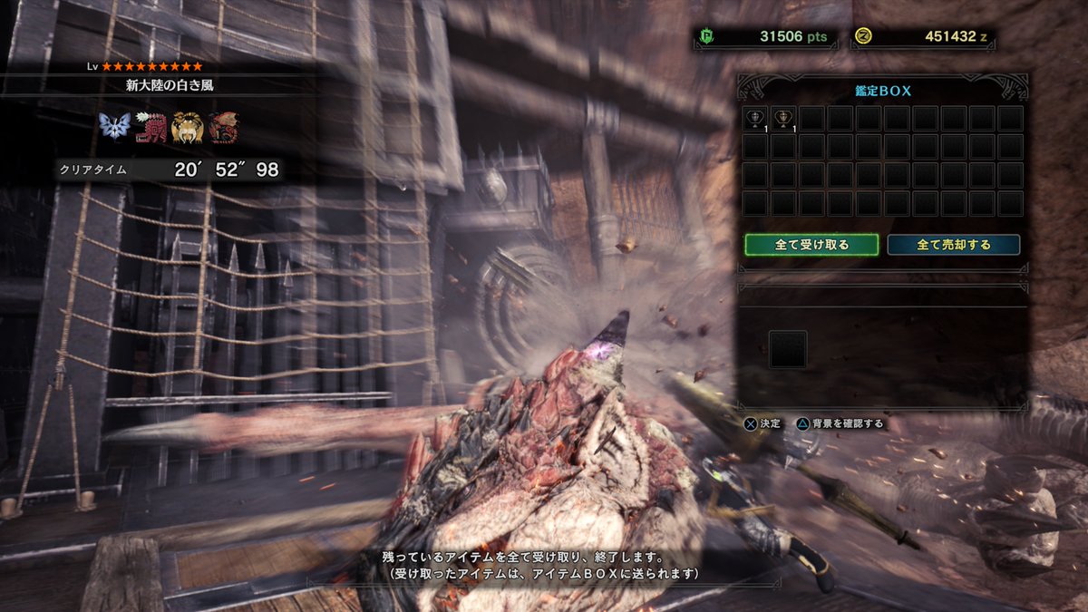 数値上の1乙目までは「歴戦キリンと『〜白き風』での自信が一瞬で折れ飛ぶ勢い」と思っていたのですが、ガード性能Lv5も瘴気耐性Lv3も貫通してくる意味のわからない火力とスリップダメージに、いっそ清々しく負けを認めました。勝てるまでやろうという気になれないのがまるで悔しくないレベルです。