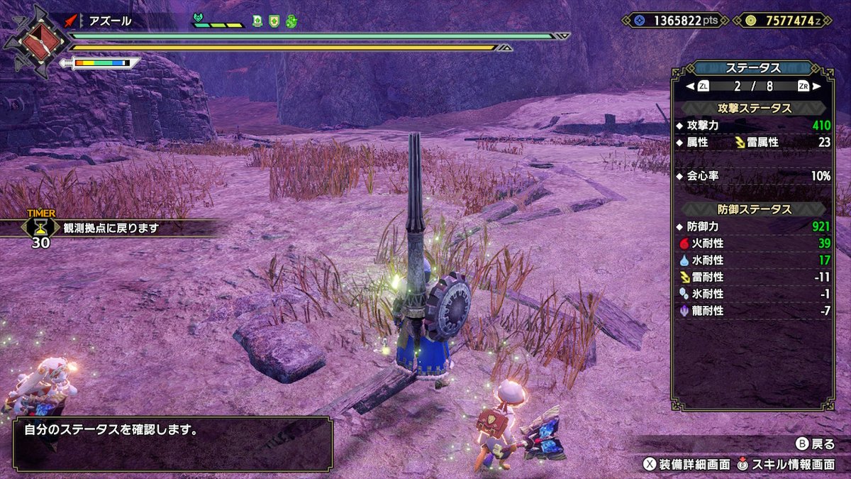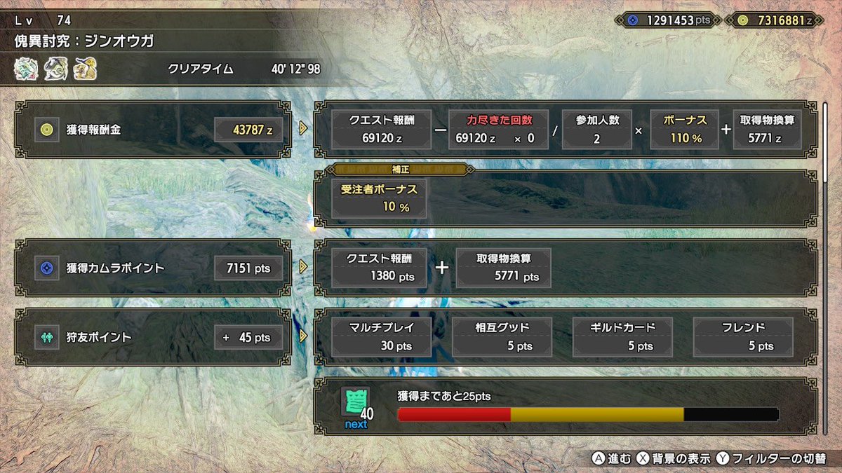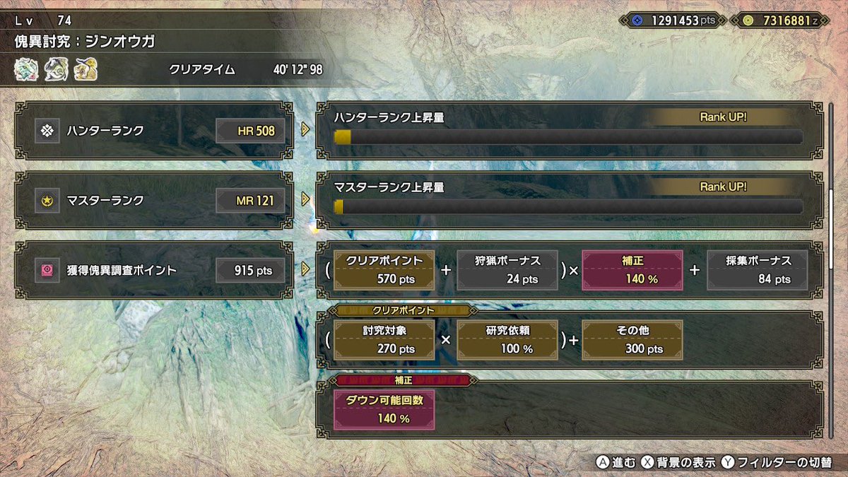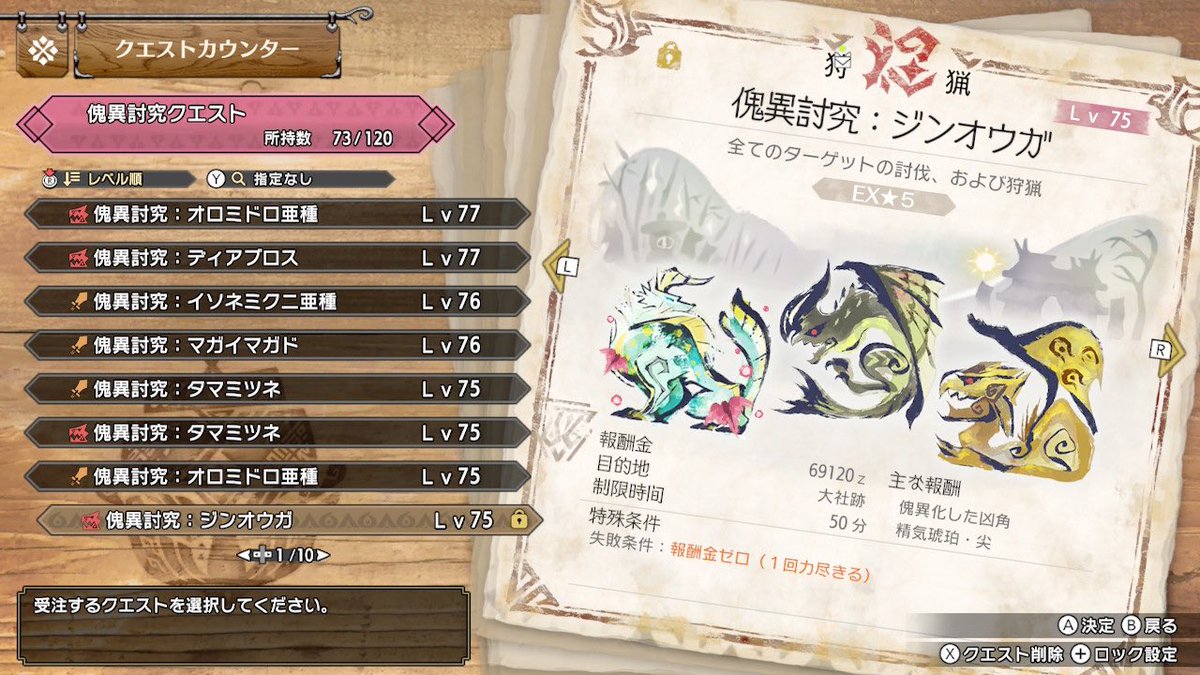 私の調査ポイントにはレベル差のせいで20%くらいに補正がかかっていて、旨みは傀異化素材なのだから、単体クエのほうが効率はいいのですが、私のレベルなんて私が「ぼーっと遊びたい」と遊んでいるうちに勝手に上がるのだから、調査対象がなければろくでもない多頭クエでいいのです。
