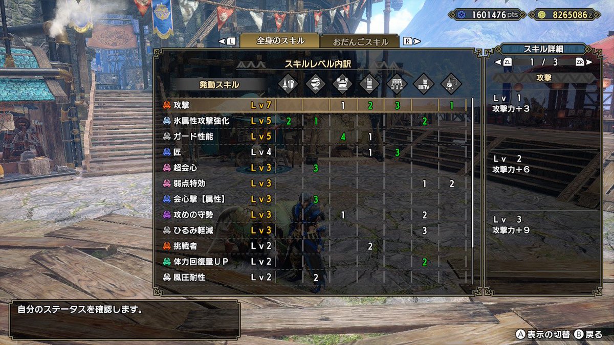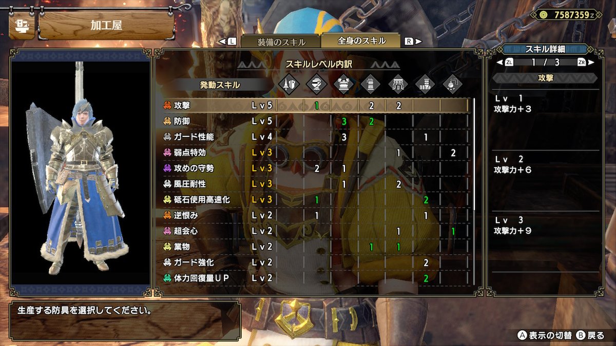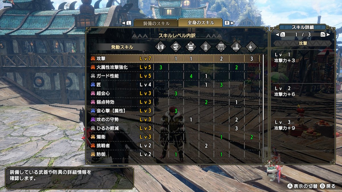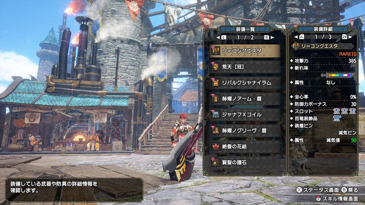 初戦3乙で「これ無理だな」と思って即座に迅錬丹で傀異錬金術を回し、攻撃3スタ急1スロ4-1-1が出たので、連続攻撃にスタミナが全然保たなかったからこれ使おうと即座にロックして、属会珠Ⅱを入れていたところに強壁珠Ⅱを入れてガ強をMAXにして、それからリベンジに行きました。