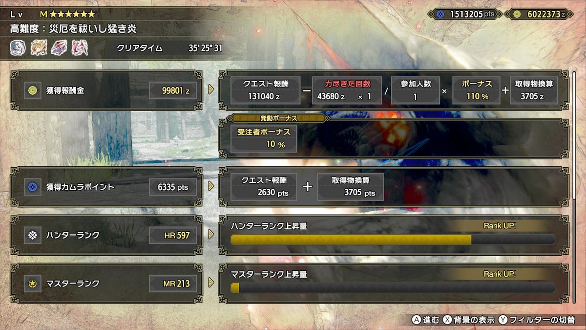 特に通話はしていなかったのですが、いつメン全員同時にサンブレイクしてました。私はMR30まで来ました。昇天突きが有効なことといったらということで、失敗が目の前まで来たMR10より1乙少ない1乙で討伐できました。