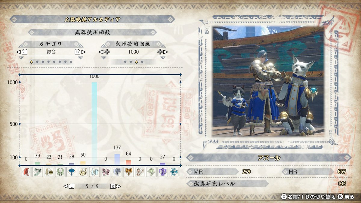 最多狩猟モンスター、当初はイブシマキヒコで、そのあと装備的に避けては通れないディアブロスが彼を上回ったのですが、今狩猟数を見てみると、なぜかマガイマガドがその間にいるのですよね。MRでそんなに狩ったという意識はないのですが……。