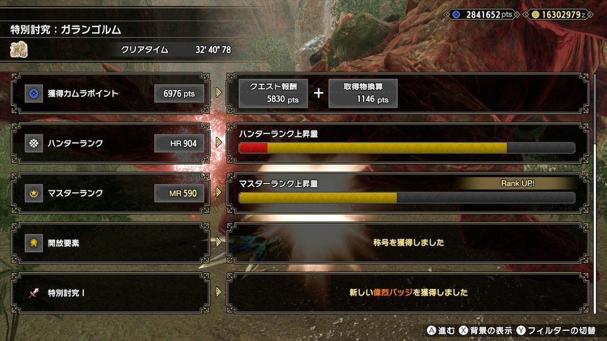 盟勇同行クエと依頼サイドクエストはこれで全クリですかね。あとは予定通りこのまま重要調査クエを埋めて、傀異化クエもやって、あと水属性ランスだけまだ作っておらず作成にオロミドロの尻尾が必要だから出るまでやって……と、まだまだ遊べますね。