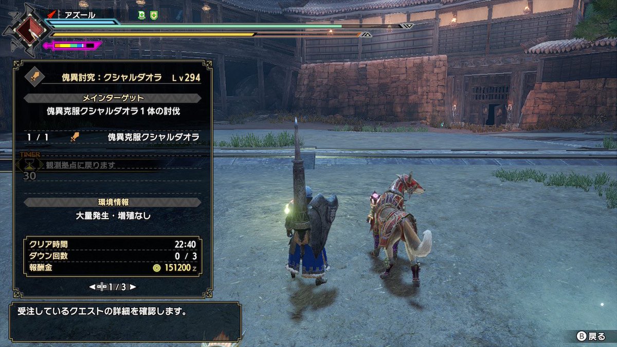 Riseだと「我ら楽土がかぞいろは」が最難関でしたが、こちらは間違いなくMHR:Sでイチバン苦戦したクエストでした。で、これでLv300行くだろとソロで行った傀克クシャ闘技場Lv294も残り時間こんなでクリアしているので、たぶんほかの特別討究もこのレベルの苦戦をし続けますね……やるか悩む……。