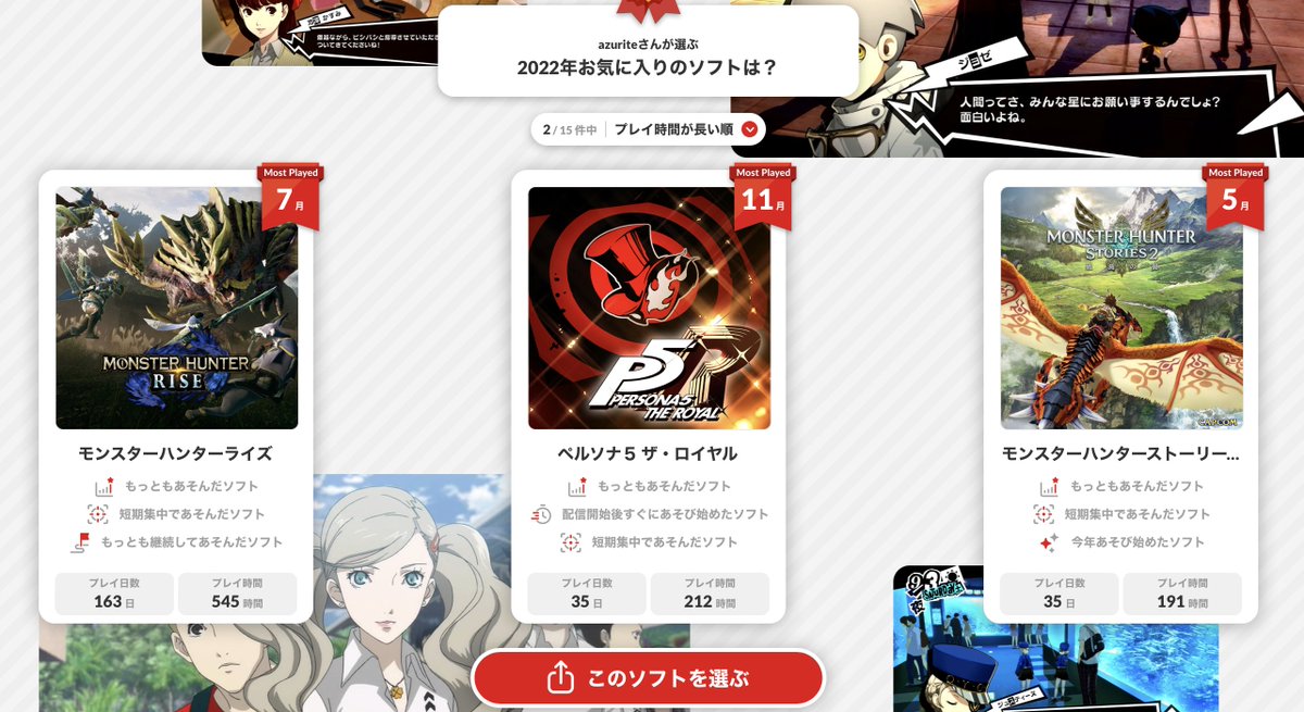 今年はこんな感じでした。プレイ本数は去年と同じ15本、総プレイ時間の概算は去年の907時間を大幅?に超えて1000時間くらいでしょうか。今年のNo.1はやはりP5Rですが、MHST2もよかったですね。RPGが豊作でした。